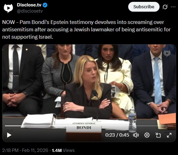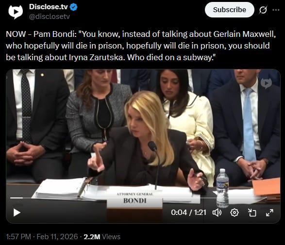 A couple of key moments occurred when a number of direct Epstein victims and survivors were in attendance, all of whom have received no help or contact from the DOJ. Bondi was more than once asked if she would turn and face them and apologize. She wouldn’t.