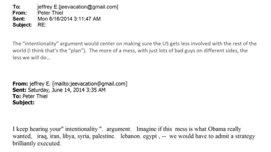 In one email exchange between Epstein and Peter Thiel, Thiel says the grand “plan” of U.S. foreign policy is to destabilize the world and make it “a mess,” because then the U.S. wouldn’t have to intervene as often against governments it doesn’t like.