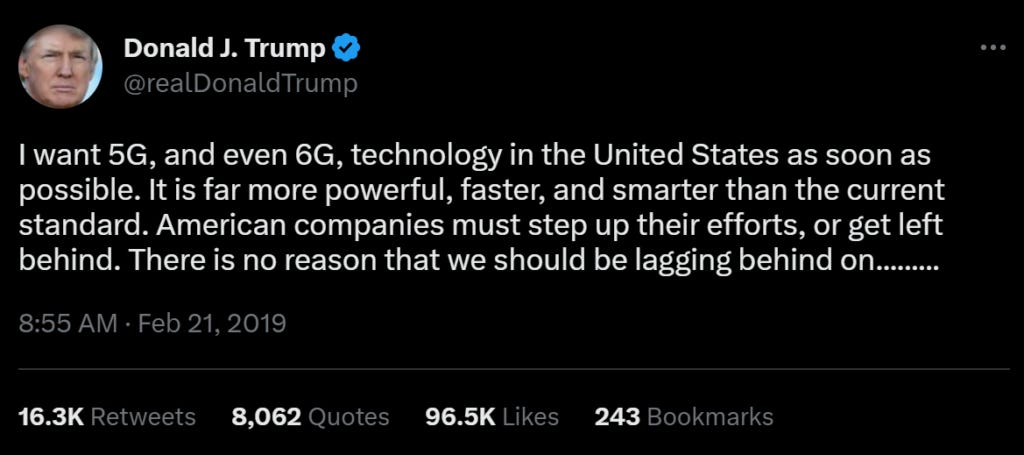 “I want 5G, and even 6G, technology in the United States as soon as possible. It is far more powerful, faster, and smarter than the current standard. American companies must step up their efforts, or get left behind. There is no reason that we should be lagging behind on………