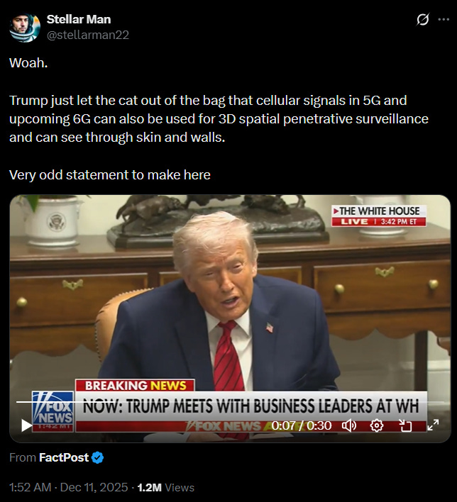 Trump then provided some peculiar remarks where it appeared he didn’t fully understand what 6G is, but at the same time implied that 6G will be used for spatial penetrative surveillance.