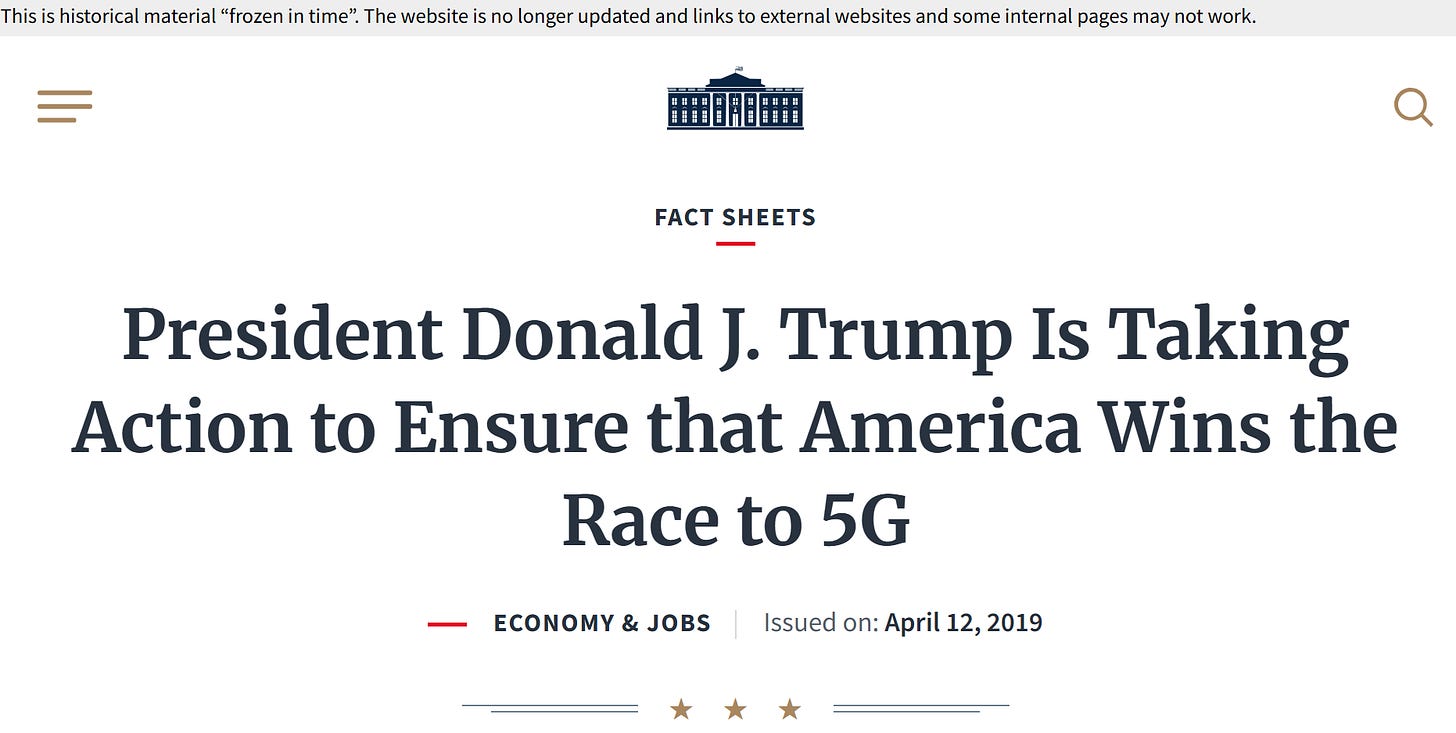 On October 25th, 2018, “President Donald J. Trump took decisive action by signing a Presidential Memorandum to develop a national strategy for spectrum policy that will advance America’s development of 5G,” according to an archived press release on an old White House website.