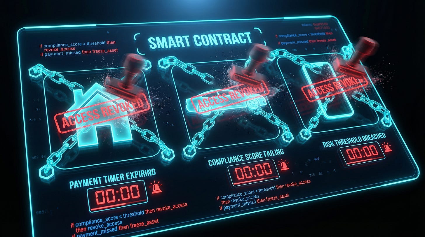 The core danger lies in programmability. Tokens are not neutral representations of property—they are code that can be designed to expire, freeze, or restrict based on compliance scores, social credit–like metrics, or algorithmic rules. Ownership becomes access, revocable at the whim of issuers, platforms, or regulators. Miss a payment? Violate a policy? Fall below a risk threshold? Your tokenized home, vehicle, or even access to services can be locked. This is not speculation—it is the explicit capability of smart contracts in a regulated, bank-integrated ecosystem.