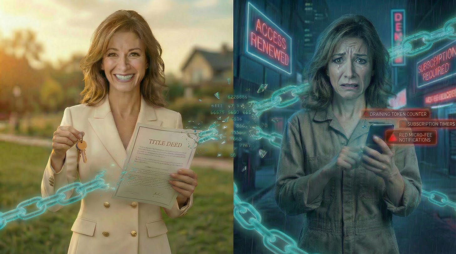 This is the financial and technological substrate for “you will own nothing and be happy”—not as a utopian sharing economy, but as a subscription-based control grid. Durable property rights are replaced by revocable permissions. Institutions trade and profit continuously while individuals rent access to what they once owned outright.