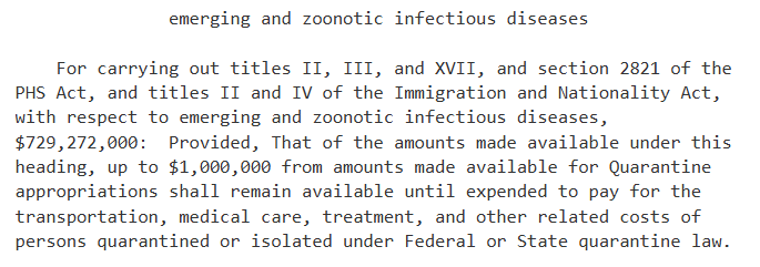 Another $729,272,000 will go to preparation for so-called emerging pathogens, specifically “zoonotic infectious diseases.” It also pays “for the transportation, medical care, treatment, and other related costs of persons quarantined or isolated under Federal or State quarantine law.”