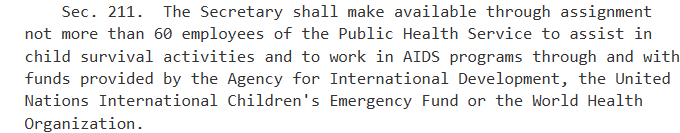 “Sec. 211. The Secretary shall make available through assignment not more than 60 employees of the Public Health Service to assist in child survival activities and to work in AIDS programs through and with funds provided by the Agency for International Development, the United Nations International Children's Emergency Fund or the World Health Organization.”